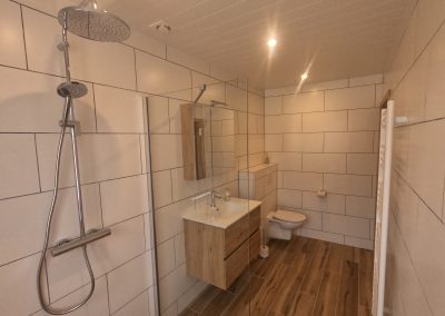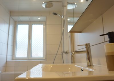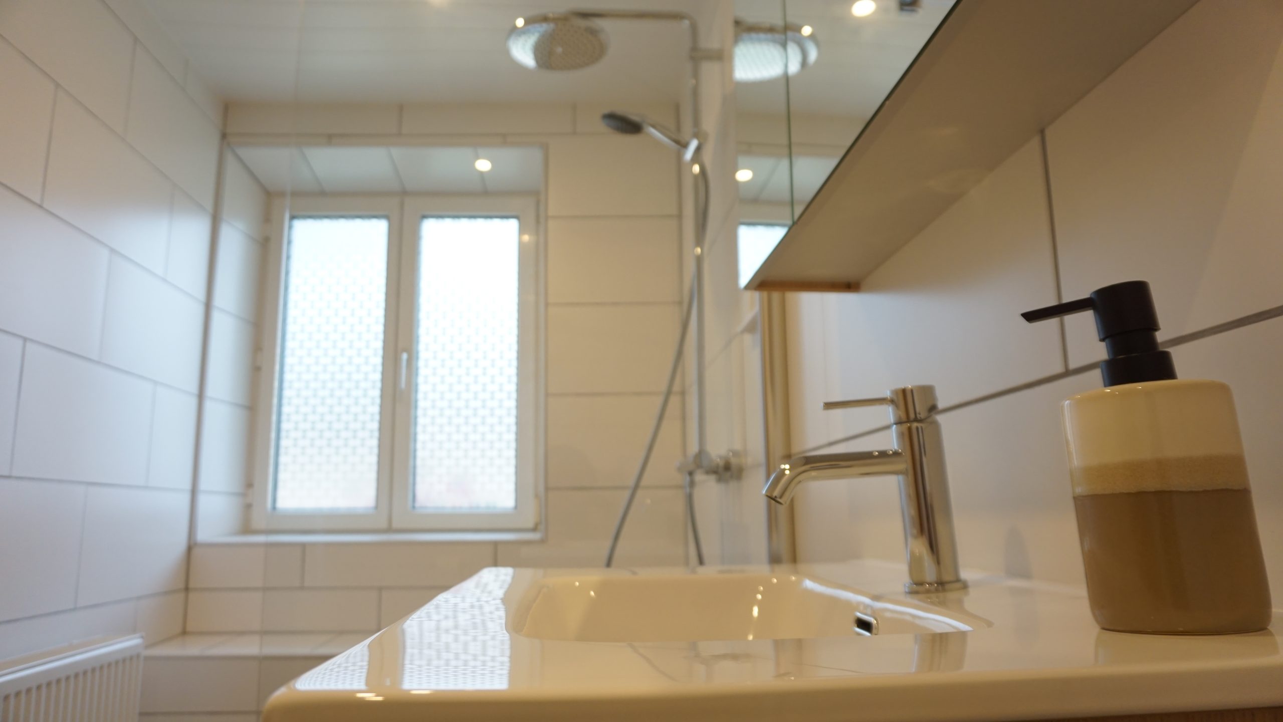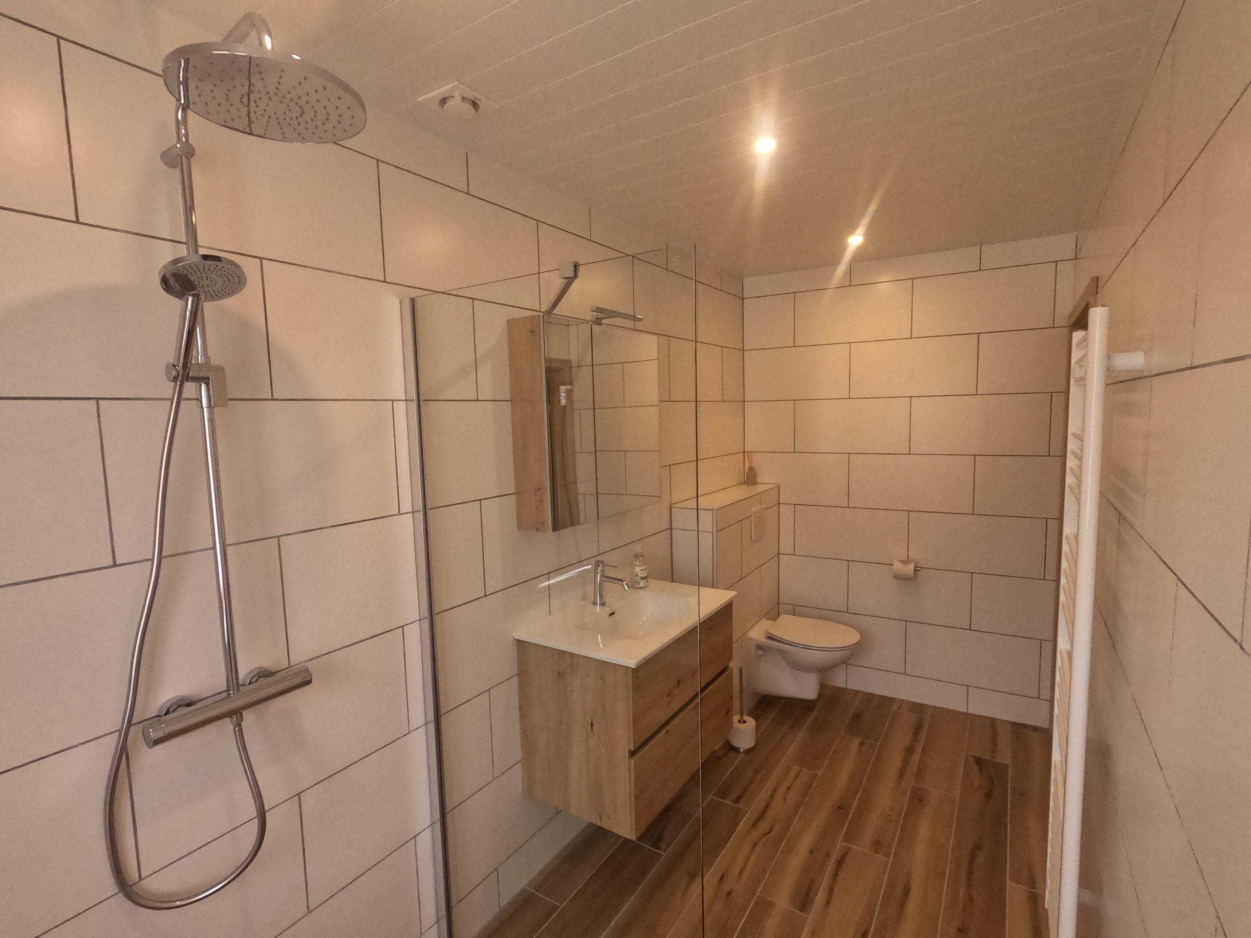 The bathroom has been completely renovated and features a shower, toilet, and vanity unit with sink. Towels are provided.