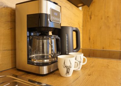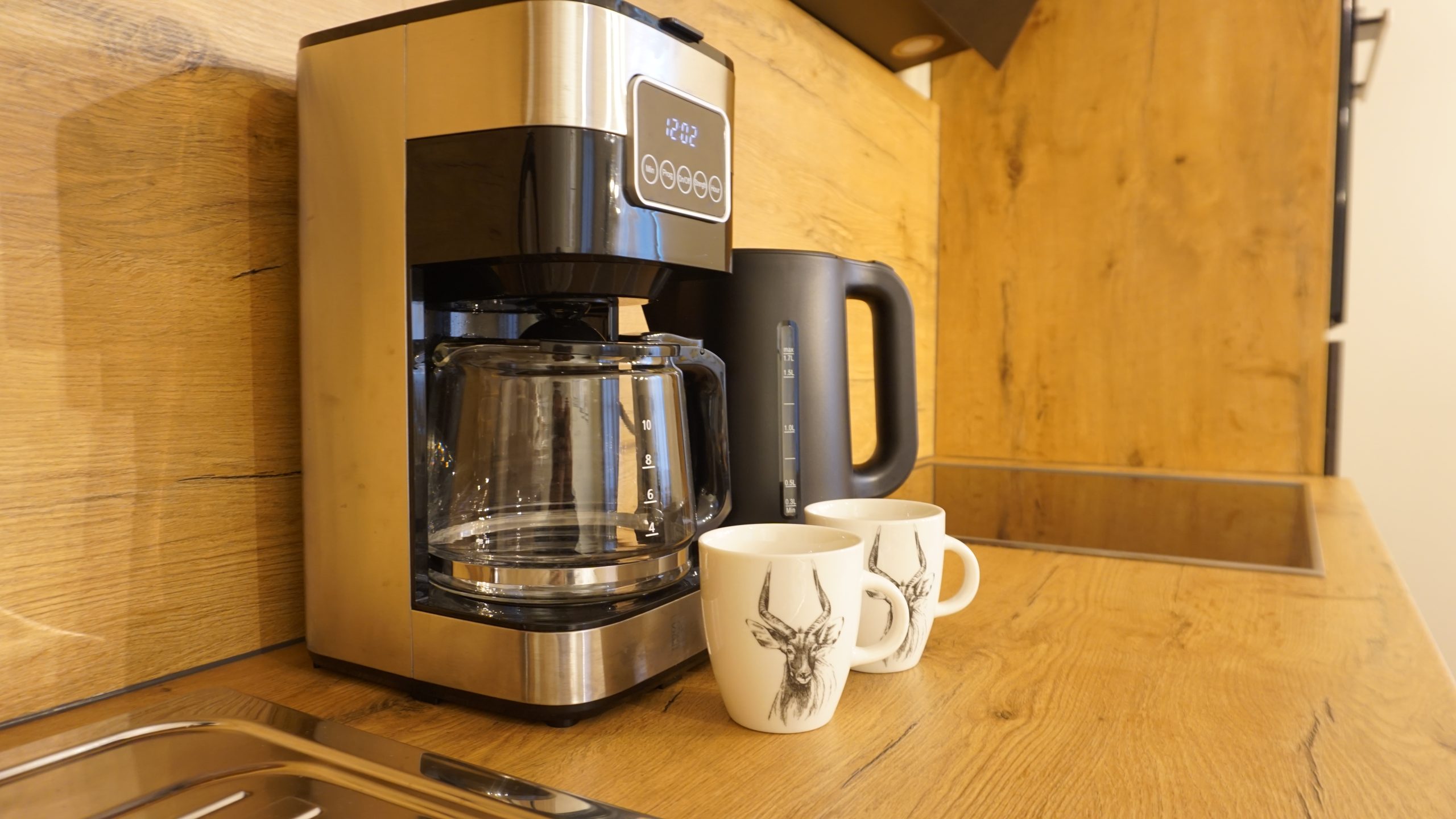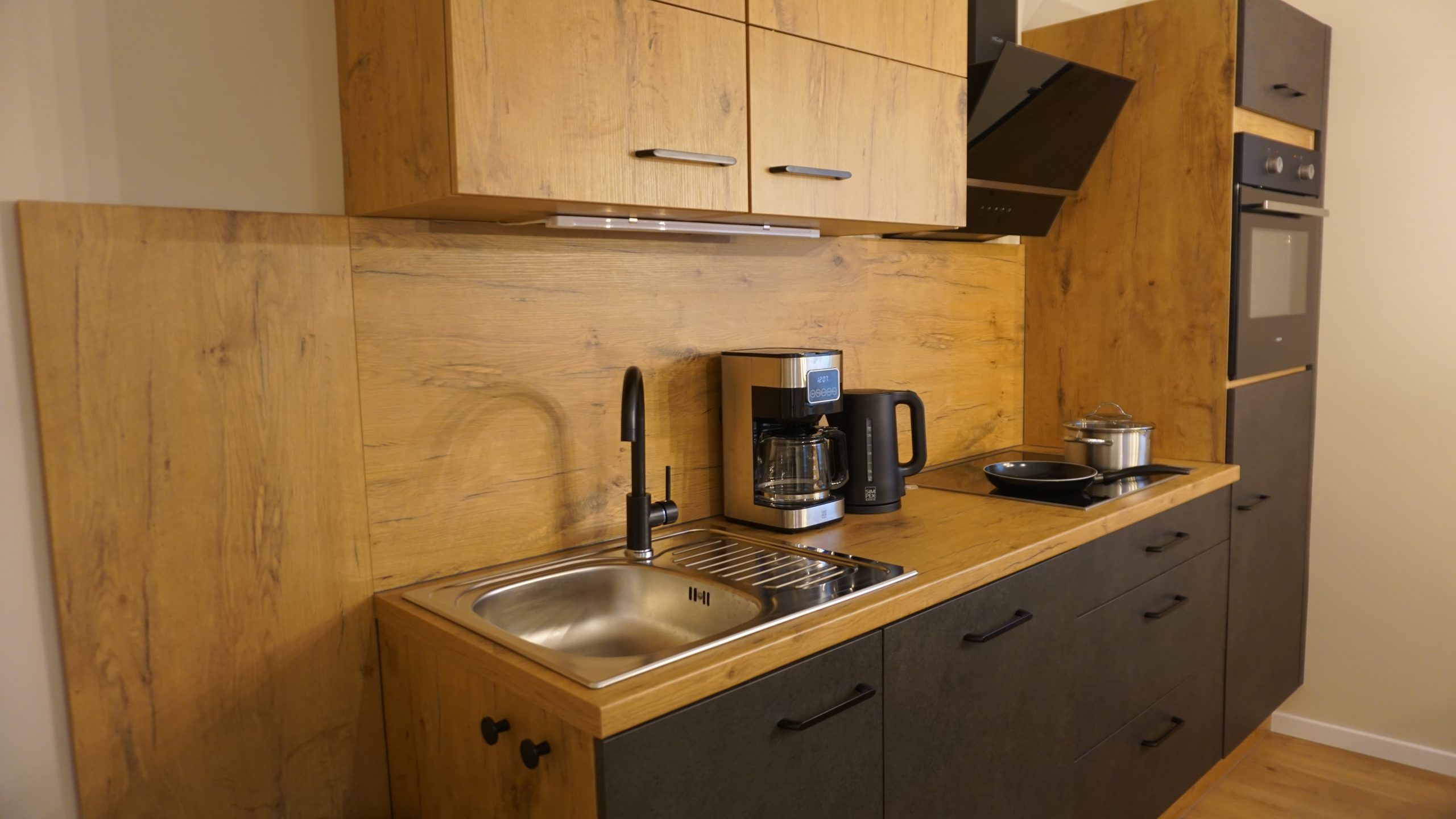 The kitchen includes a fridge with freezer compartment, induction hob, oven, dishwasher, coffee machine and kettle. In the cosy living room, you’ll find a dining area, a spacious sofa and a smart TV.